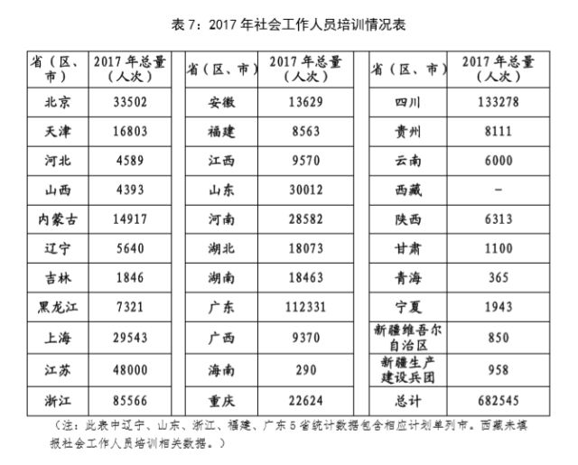 2017年,各地大规模组织开展各类社会工作专业培训,参训人员总量达682545人次,比2016年增加156170人次。其中,北京、江苏、浙江、山东、广东、四川培训社会工作人员超过3万人次。