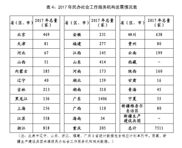 截至2017年底,各地共成立7511家民办社会工作服务机构,比2016年增长1631家。其中,广东民办社会工作服务机构总量超过1400家,江苏、浙江、四川民办社会工作服务机构总量超过500家。