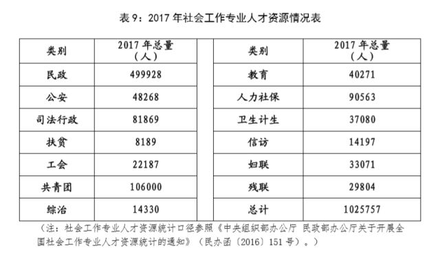 截至2017年底,全国社会工作专业人才资源总量为1025757人。