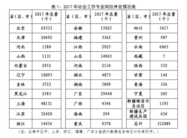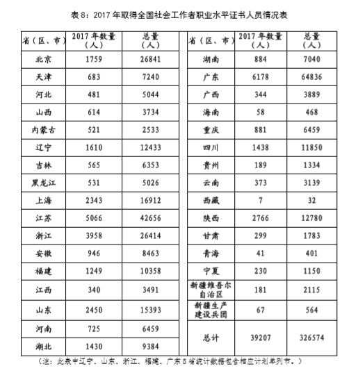 截至2017年底,全国取得助理社会工作师和社会工作师证书的人员共326574人,比2016年增长39207人。其中,广东持证社会工作人员超过6万人,北京、江苏、浙江超过2万人,辽宁、上海、福建、山东、四川、陕西超过1万人。