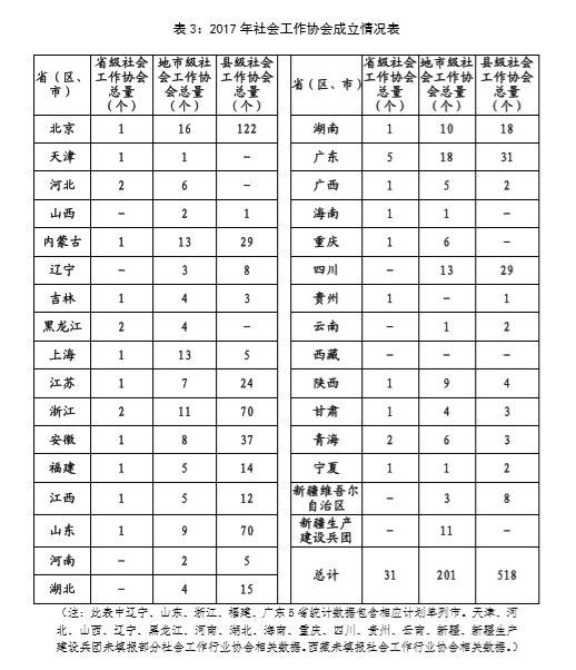 截至2017年底,各地共成立了31个省级、201个地市级和518个县级社会工作(者)协会(联合会),各级社会工作行业协会共750家。