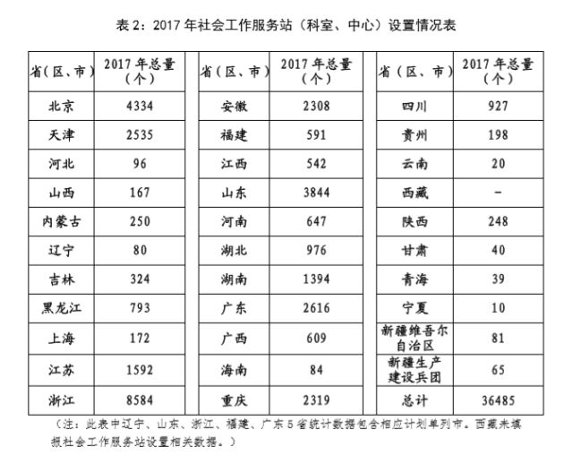 截至2017年底,各地在城乡社区、相关事业单位和社会组织等共设置社会工作服务站(科室、中心)36485个。