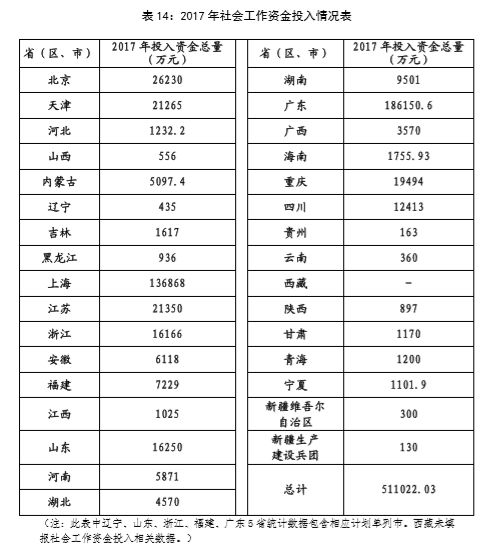 北京、天津、江苏、浙江、山东、重庆、四川社会工作投入超过1亿元。
